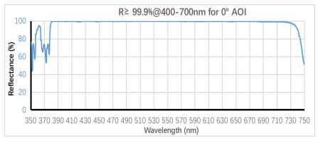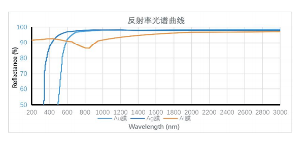 镀金高反镜在红外光谱中有较高的反射率,在空气中有较高的化学稳定性,不易氧化。在恶劣的环境中依然可以保持很好的反射率和光谱特性。银反射镜在可见光和近红外光有很高的反射率,镀保护膜后有很好的抗擦和牢固度。铝反射镜主要是在紫外和可见光有很高的反射率,镀保护膜后,表面不易划伤,能擦拭。
