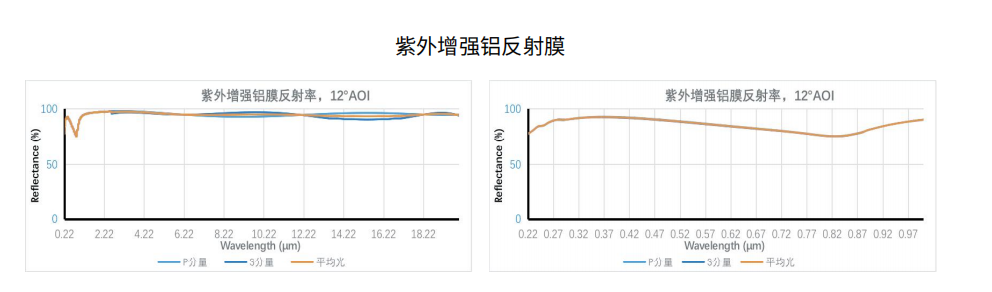 我司的紫外增强铝膜反射镜是紫外应用中经济高效的解决方案。由于裸铝膜非常软,且容易受到损坏,我们在铝表面镀两层保护膜,以延长反射镜的使用寿命。我们的紫外增强铝膜在 250到 450 nm的波长范围内具有大于90%的反射率。