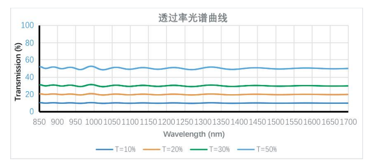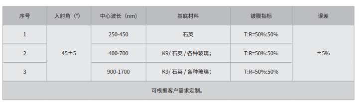 光强分光膜是按照一定的光强比把光束分成两部分的薄膜使得一部分光线透过镜片,并反射剩余的光线,这种薄膜有时仅考虑某一波长,叫做单色分光膜;有时需要考虑一个光谱区域叫做宽带分光膜;用于可见光的宽带分光膜,又叫做中性分光膜。