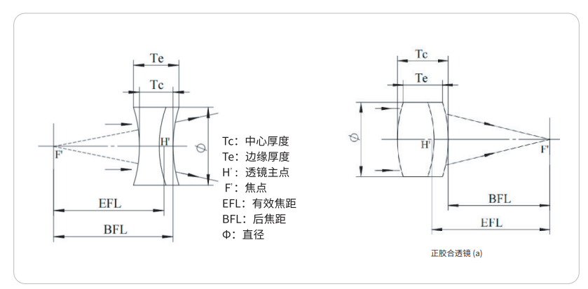 将两个折射率不同的单透镜胶合,这种组合透镜具有短焦长、大放大率和较好成像质量的特点。其使球差、慧差和色差等近轴像差都得到了很好的校正,已在天文望远镜和照相机中广泛使用。