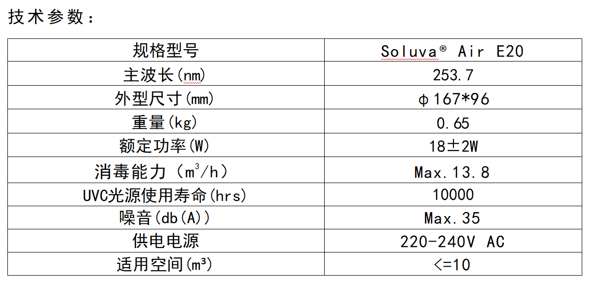 Soluva® Air E20可循环并净化封闭空间内空气,杀菌模块中的253.7nm紫外线,配合进口纳米级活化层,在精准破坏细菌病毒的遗传物质的同时,可去除甲醛、乙醛、甲苯等有害物质,实现全空间的净化消毒。 整个消毒过程绿色安全,无紫外线泄露,无化学品添加,无臭氧产生。