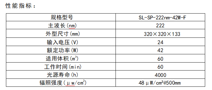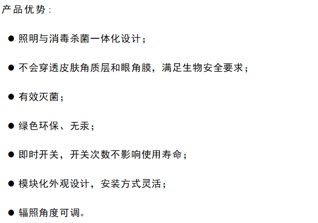 使用方法:吊顶式安装于不大于60m³ 的密闭空间内,在室温下,相对湿度不大于 80%的条件下,连续开机60分钟以上,可达到空气消毒要求。